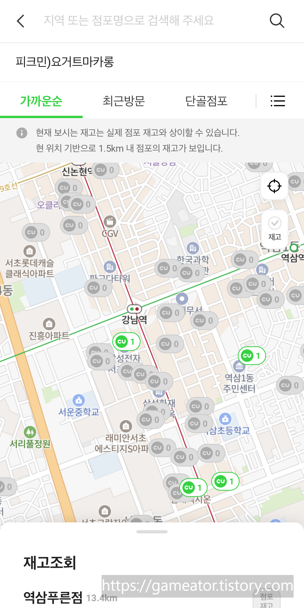 찾고 싶은 상품을 누르게 되면 위 사진들처럼 지도가 뜨고 CU점포에 몇개의 재고가 남아있는지 뜨게 됩니다. 저는 커스타드도넛과 요거트마카롱 두가지를 모두 검색해보았는데, 커스타드도넛은 다른 점포에도 거의 없는 모습이고 요거트마카롱은 몇몇 점포에 입고되어 있는 것으로 보입니다.