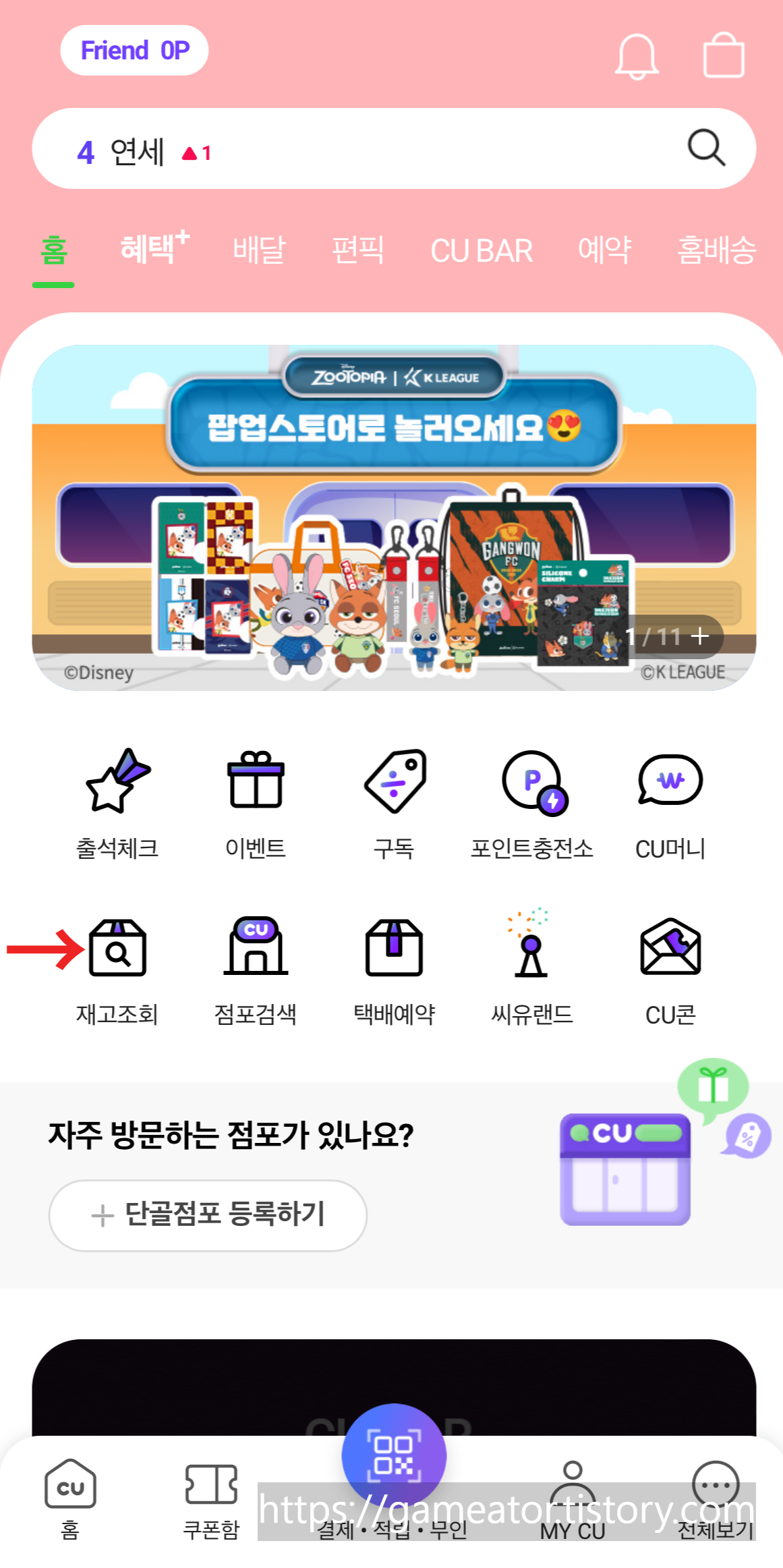 CU앱의 메인화면에서 빨간색 화살표의 [재고 조회]를 눌러준 후에 찾고 싶은 상품을 입력합니다. 저는 피크민으로 입력해서 관련 상품을 찾아보겠습니다. 검색 후 찾고 싶은 상품을 클릭해줍니다.