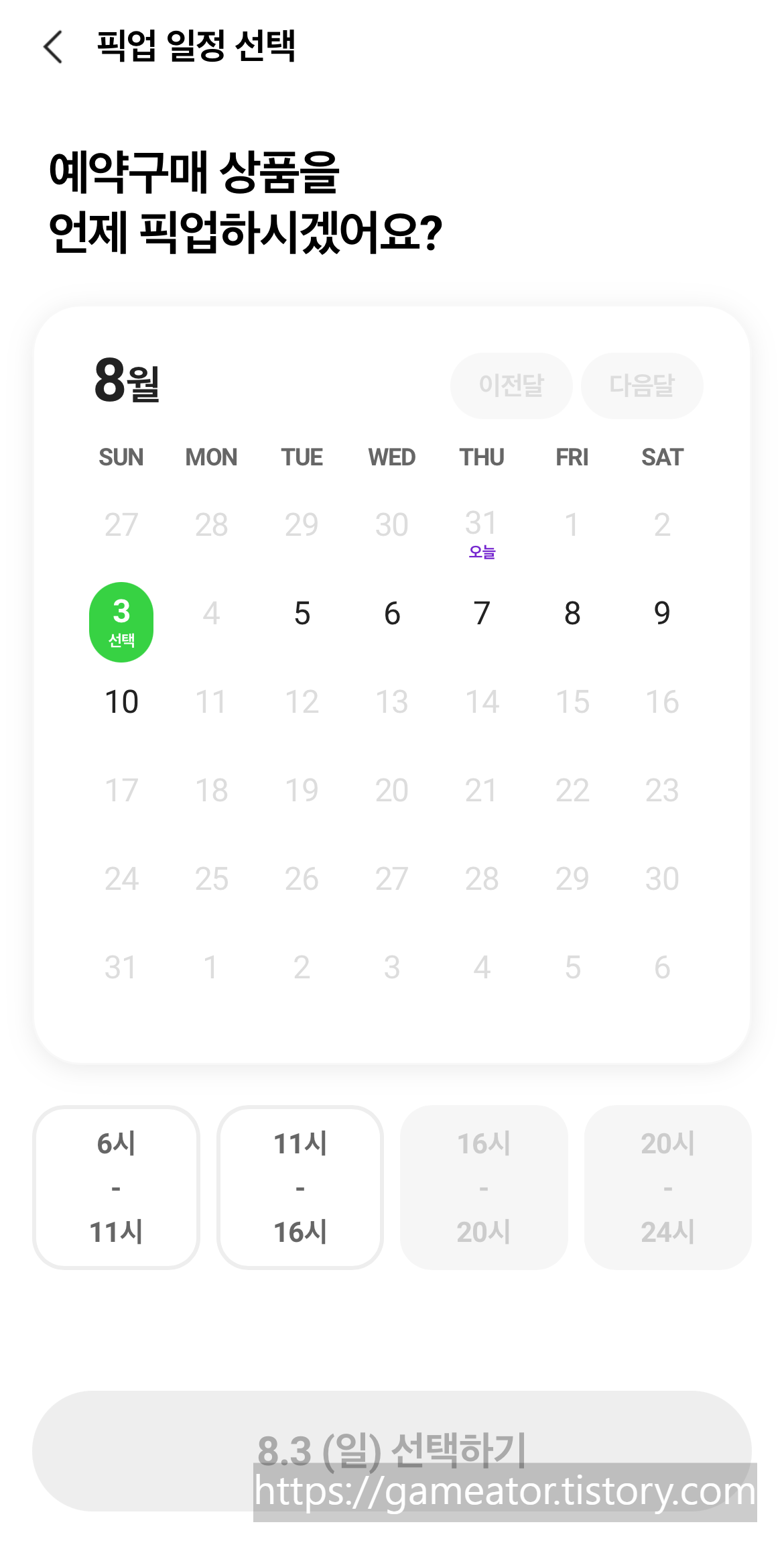 현재 확인해본 결과 시간은 대부분의 점포가 사진처럼 고정되어 있으며, 제일 빠르게 수령 가능한 날짜는 8월 2일~ 3일 정도 되는 것으로 보입니다.
