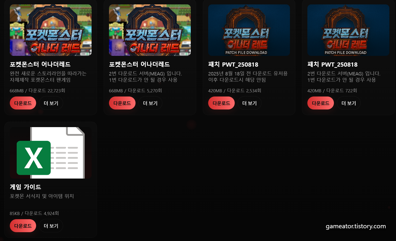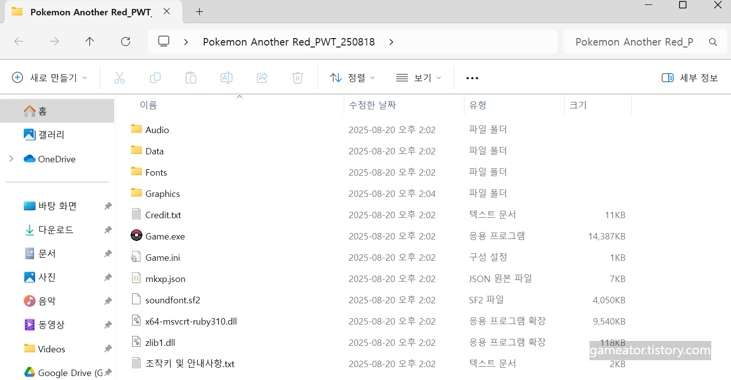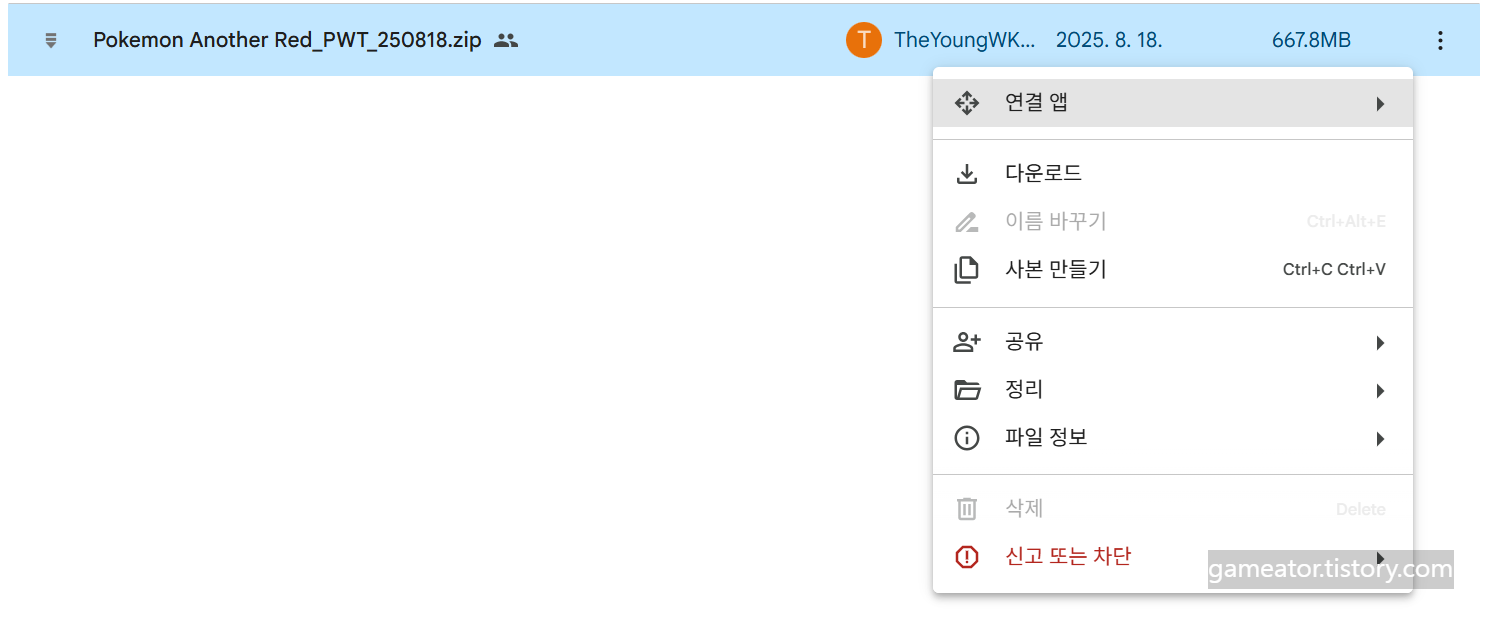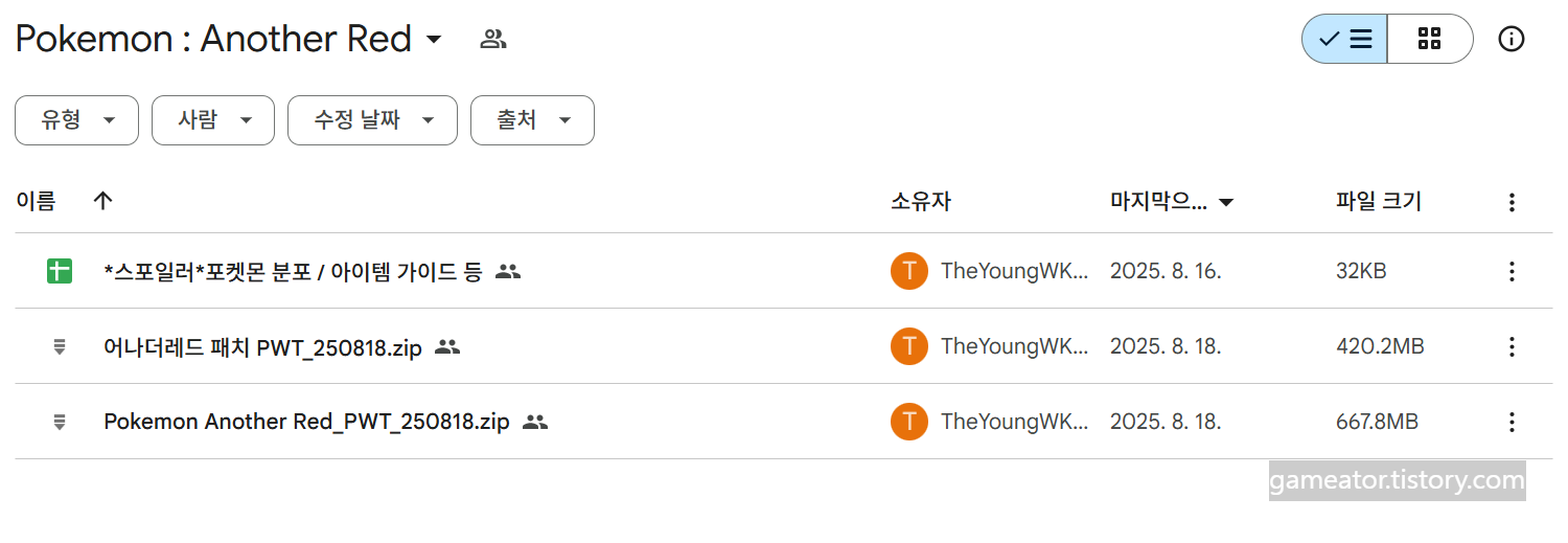 구글 드라이브에서 다운로드 시 가장 아래에 있는 [Pokemon Another Red_PWT_250818.zip] 파일을 다운로드 해주시면 됩니다.