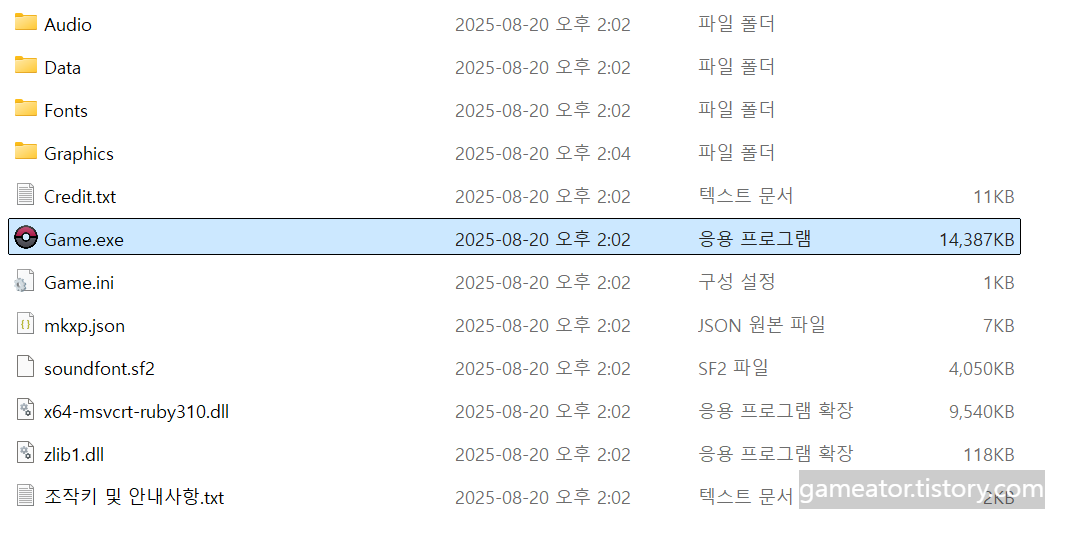 위 스크린샷에 보이는 파란박스(Game.exe)를 더블클릭하여 실행하시면 됩니다. (※컴퓨터 설정에 따라 exe 확장자 표시 없이 Game 이라고 표기되어 있을 수도 있습니다)